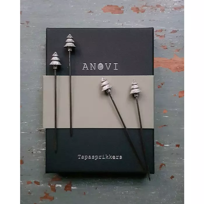 De tapasprikkers zijn een zuiver tinnen product en worden ambachtelijk vervaardigd in Nederland. Ze worden per vier stuks aangeboden in een zwart luxe doosje.