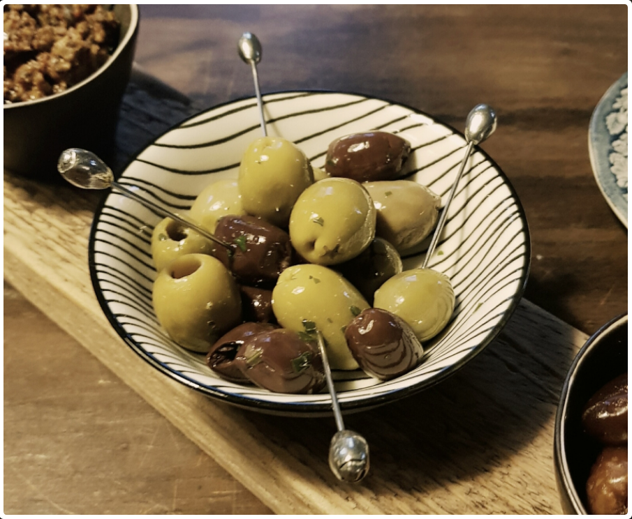 Het topstukje van de tapasprikker heeft een afbeelding van een olijf. Olijven mogen immers niet ontbreken op een goed gevulde tapasplank!