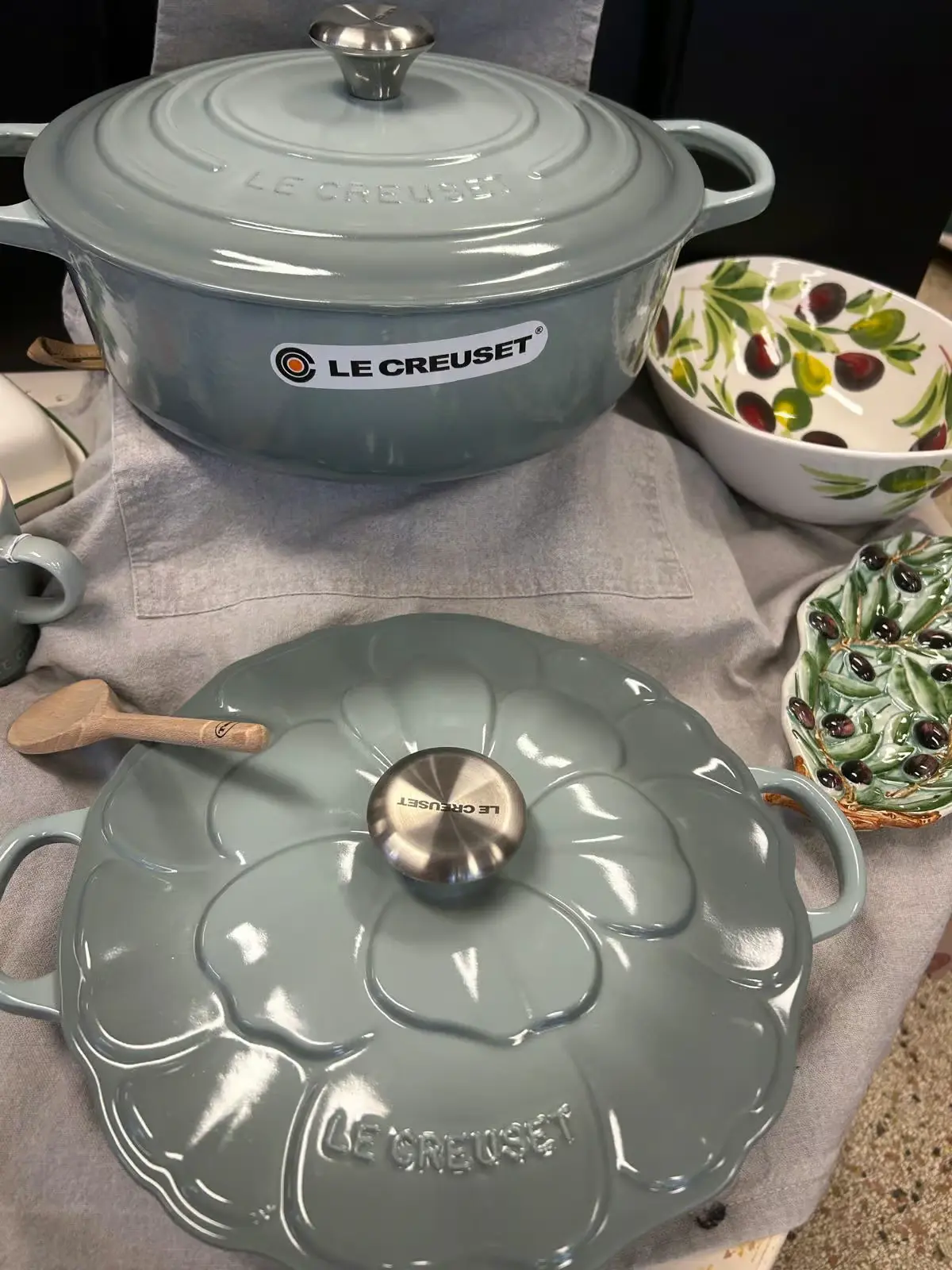 De nieuwe lijn van Le Creuset biedt echt prachtige pannen (die zo op tafel kunnen) en aardewerk zoals mokken, in de kleur Seasalt.