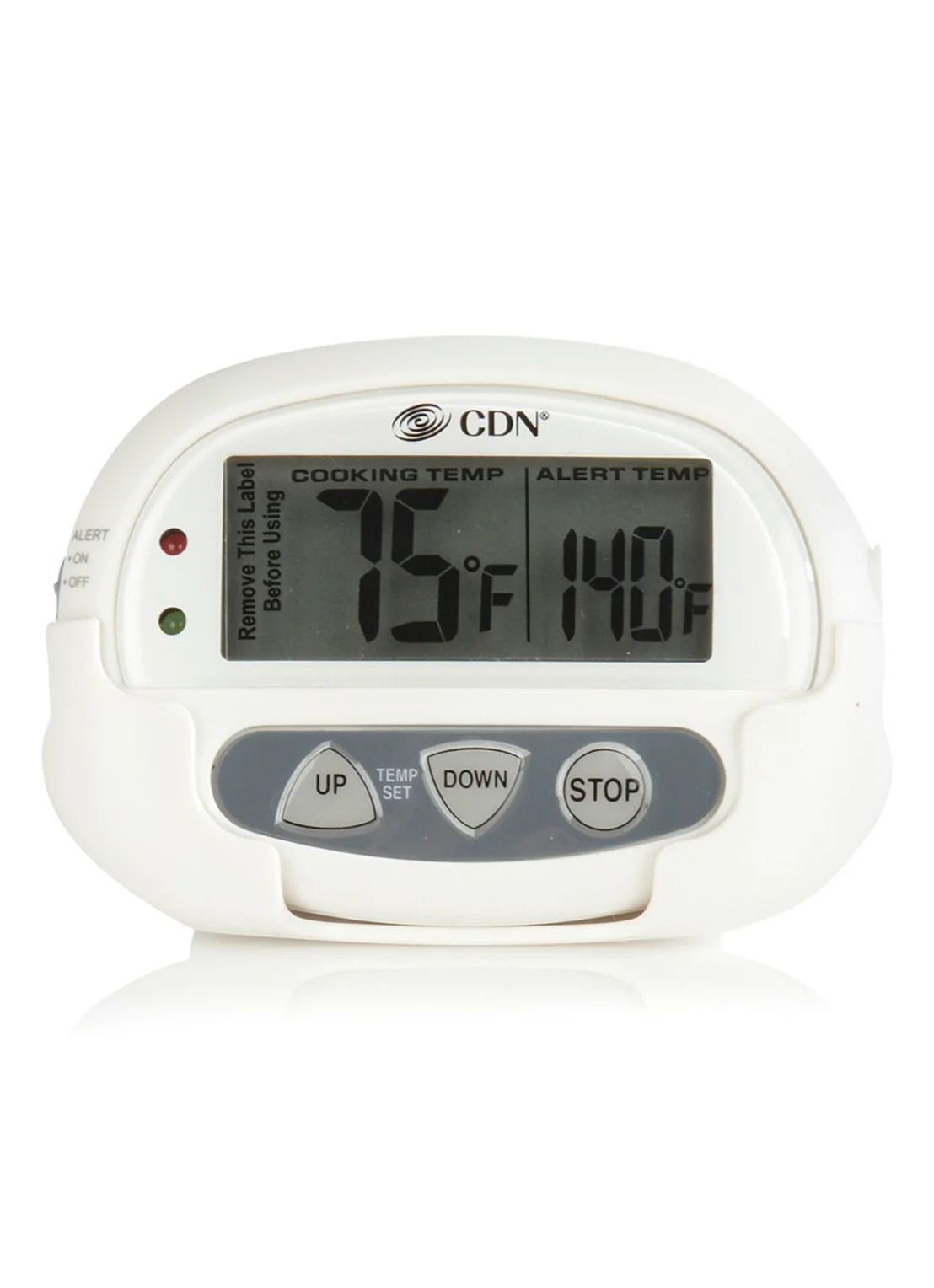 De CDN digitale thermometer meet temperaturen van 0°C tot 200°C. De temperatuur is eenvoudig in te stellen door de up en down knoppen aan de voorzijde. Op het scherm wordt zowel de huidige temperatuur als de ingestelde temperatuur aangegeven. Zo heeft u altijd een goed zicht op het kookproces. Zodra de ingestelde temperatuur bereikt is zal zowel een visueel signaal als een geluidssignaal gegeven worden.