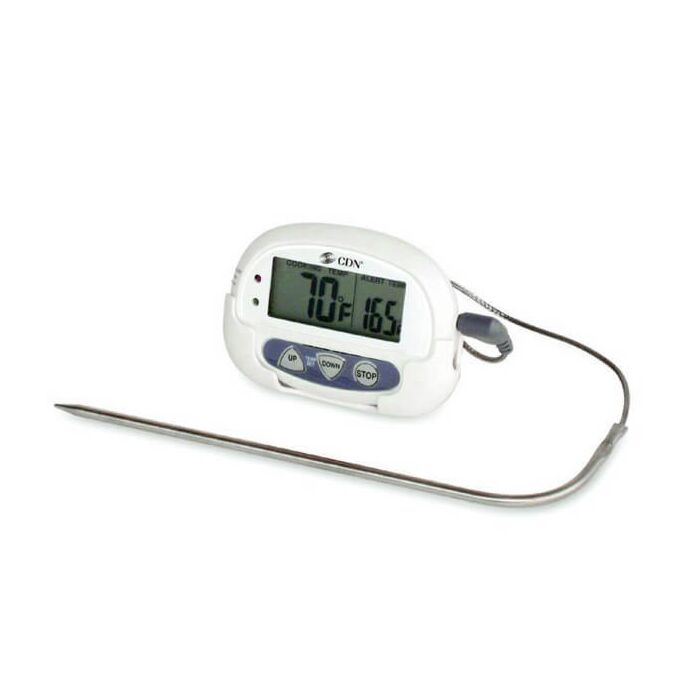 Deze digitale thermometer van CDN is geschikt voor het meten van de temperatuur in onder andere vlees, vloesitoffen en puddingen. De thermometer heeft een bereik van 0°C tot 200°C. De sonde aan deze thermometer heeft een lengte van 14 cm en wordt via een 90 cm lang snoer naar de thermometer geleid. Steek voor het perfecte resultaat de sonde minstens 2,5 cm in het te bereiden gerecht.
