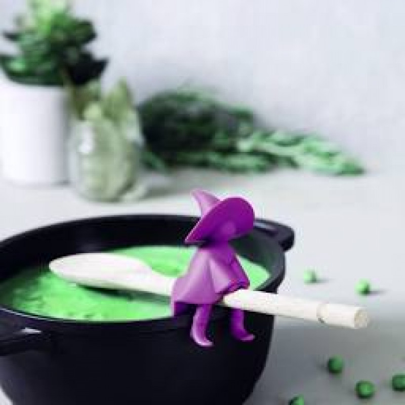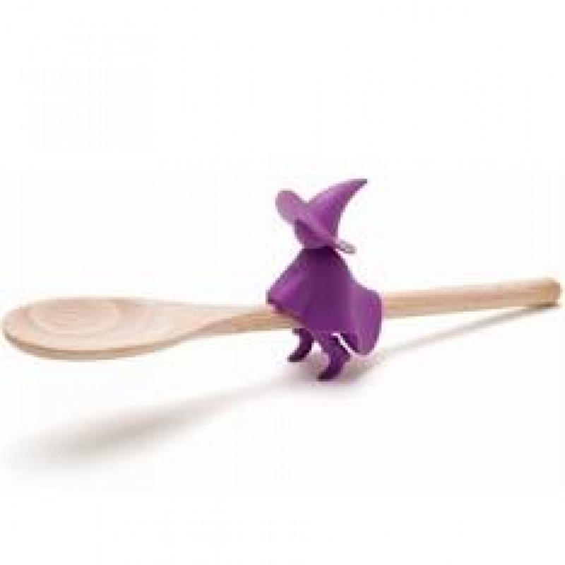 De Ototo Agatha lepelhouder is gemaakt van paars silicone. De lepelhouder is vormgegeven als een vliegende heks en kan om de steel van een pollepel geplaatst worden. Hierdoor kunt u de lepel van het aanrecht af houden en kunt u de lepel gebruiken om het deksel van de pan omhoog te houden