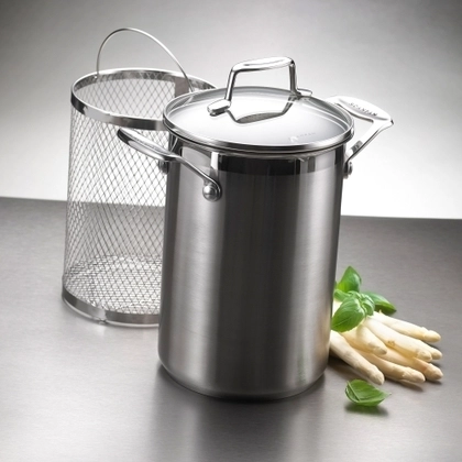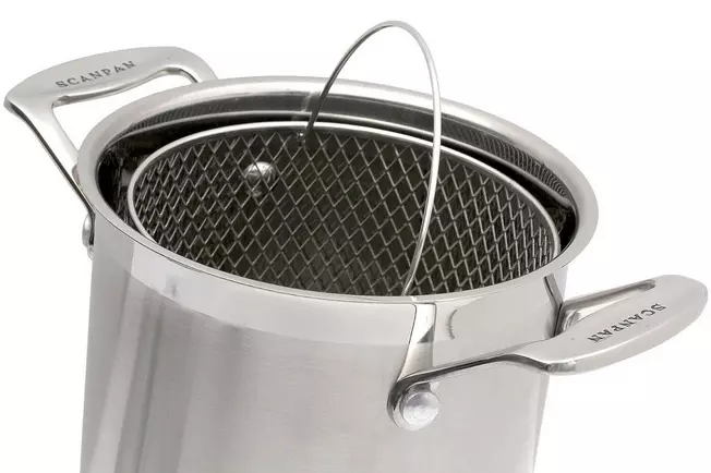 De aspergepan, van 16cm doorsnede en een inhoud van 4,5L, is voorzien van een inzet waar grofweg 1,5kg asperges in kunnen. De pan zelf is voorzien van een sandwichbodem welke bestaat uit twee lagen RVS en een binnenkern van aluminium. Hierdoor wordt de warmte goed verspreid en kun je de asperges, als je wilt, na laten garen in de pan. Omdat de pan voorzien is van een glazen deksel kun je het gaarproces gemakkelijk in de gaten houden. Na gebruik kan de Scanpan aspergepan gewoon in de vaatwasser.