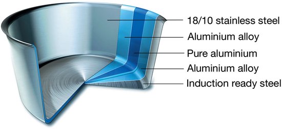 De materialen van de vijf lagen worden zorgvuldig geselecteerd: 18/10 stalen binnenkant voor hoge slijtvastheid, aluminium kern voor uitstekende warmtegeleiding, 18/0 staal voor gebruik op inductiekookplaten. Deze constructie kan ook een voordeel zijn als uw inductiekookplaat gevoelig is voor de minimumafmetingen van het kookgerei.